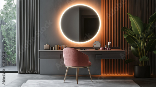 Fototapeta - Toaletka wyposażona w okrągłe lustro z delikatnym podświetleniem i wygodne krzesło w odcieniu.