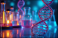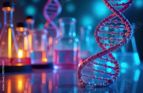 DNA Helix in Lab Setting Red Model with Beakers, Scientific Research, Genetic Engineering, Medical Breakthrough, Blue Lighting, Modern Laboratory