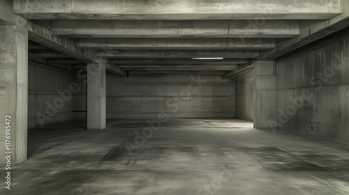 Fototapeta - Pusty garaż z betonowymi szarymi ścianami, tworzący abstrakcyjną i surową atmosferę.