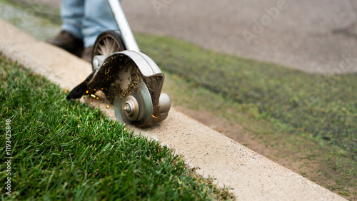 Fototapeta - Landscape worker power edging green lawn next to curb.