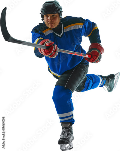 Fototapeta - Committed hockey athlete showcases mastery of attack and pass techniques against transparent background. Concept of professional sport, competition, movement, energy, tournament, match. Ad