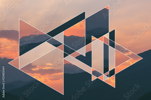 Image of the forest, mountains at the sunset and the sacred geometry symbol, collage