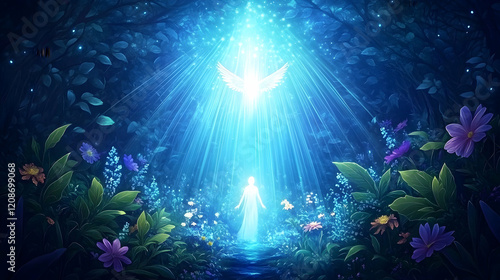 Enchanting glowing forest path, ethereal figure, divine light, peaceful background, fantasy art