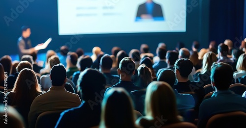 >Naklejka na meble>Un groupe de personnes assises dans un auditorium ou une salle de conférence écoutant un intervenant réalisant une présentation sur un écran géant.