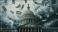 >Naklejka na meble>Capitol building under dark stormy skies with flying dollar bills representing government, economy, finance, and currency flow in political context.