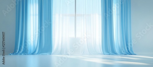 Bright and airy bedroom interior featuring blue sheer curtains and natural light illuminating empty space for text and design elements