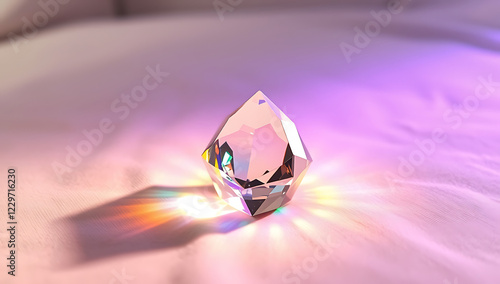 Fototapeta - A vibrant and mesmerizing display of rainbow-colored light refractions passing through a perfectly cut crystal prism, creating a spectrum of hues on a soft surface.