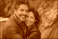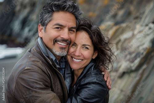 Portrait of a grinning latino couple in their 40s sporting a classic leather jacket isolated in rocky shoreline background