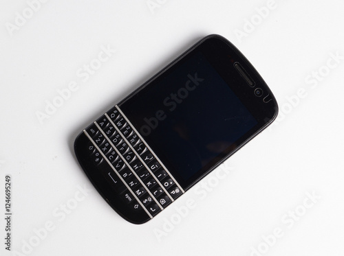 Fototapeta - Old mobile phone with black screen, isolated on white.