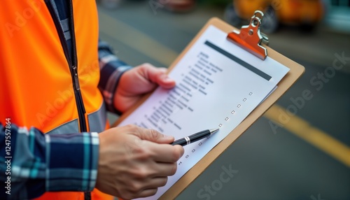 Fototapeta - Construction worker checks safety checklist on clipboard. Worker wears high-visibility vest. Focuses on compliance on job site. Ensuring safety protocols followed. Documentation of procedures for