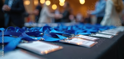 >Naklejka na meble>Many blue lanyards, name tags arranged on table. Event preparation underway. Indoor setting. Potential for business meeting. Rows of lanyards. Ready for attendees. Professional event meeting. Neatly