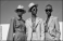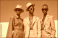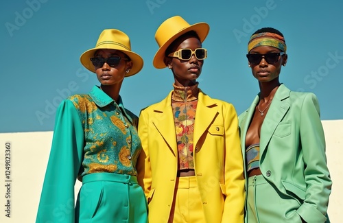Fototapeta - Three stylish models showcase modern South African fashion. Vibrant colours, striking outfits featured. Wear chic contemporary apparel, accessories like hats, sunglasses. Models outdoors under bright