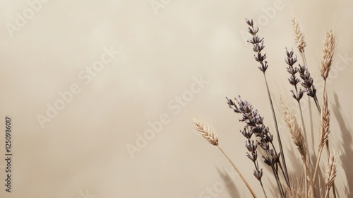 Dried lavender and wheat on beige background; minimalist design, website banner