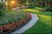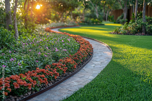 >Naklejka na meble>Decorative metal lawn edging creating a clear separation between the garden bed and the lawn, highlighting the neat, manicured outdoor area.