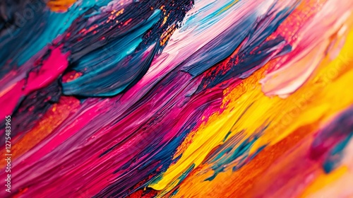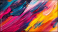Textura vibrante de colores en un lienzo, con pinceladas audaces de rosa, azul y amarillo que crean una sensación de movimiento.