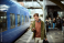Fototapeta - Mature man using a smart phone while waiting for his train at the train station