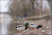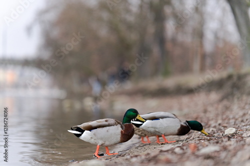 Fototapeta - kaczki krzyżówki spacerujące i żerujące nad brzegiem rzeki