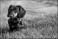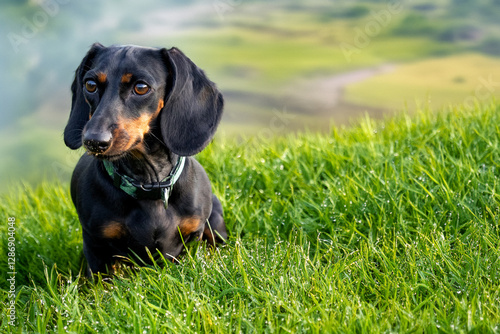 Fototapeta - Jamnik siedzący na trawie, odpoczywający na zielonej murawie. Spokojna poza, urokliwy wygląd i charakterystyczna sylwetka tej rasy.