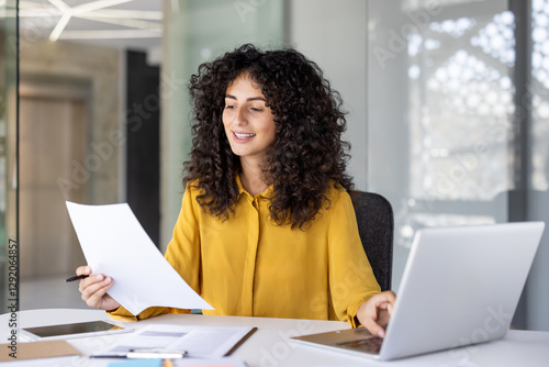 Fototapeta - Successful and joyful woman at workplace checking financial reports and contracts. Businesswoman doing paperwork inside office, using laptop. Financier preparing and filling out tax forms.