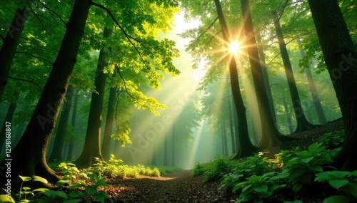 Fototapeta - Soft sunlight filtering through the forest canopy, forest, leaves, canopy
