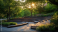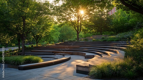 Fototapeta - outdoor amphitheater park with curved seating golden hour light lush greenery modern architectural design and serene urban nature leisure environment