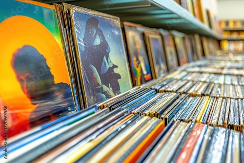 Fototapeta - A captivating perspective of vinyl records stacked on shelves, their vibrant album art creating a rich tapestry of musical nostalgia and artistic expression.