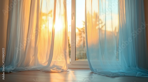 Soft sunlight filters through a sheer curtain swaying by the open balcony door