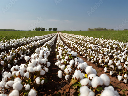Fototapeta - Cotton Plantation under Blue Sky: Rows of fluffy cotton bolls stretch to the horizon under a clear blue sky, showcasing the beauty of agricultural harvest.