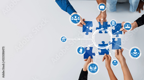 >Naklejka na meble>Hands engaged in collaborative puzzle assembly represent teamwork and innovation. A visual metaphor for problem-solving and strategic connections in a modern workspace. Amity