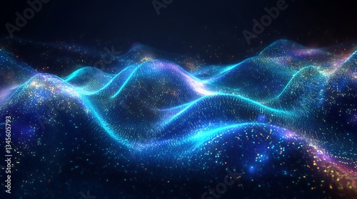 Fototapeta - High-tech quantum circuit emitting dynamic waves of energy, abstract depiction of data pulses glowing in a dark environment, intricate holographic patterns with radiant blue and green colors,