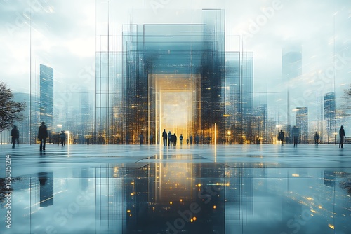 Futuristic city gate, people walking, urban dawn, reflection, future concept