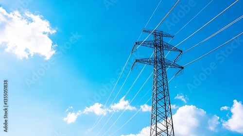 High voltage power lines stretching across a clear blue sky with fluffy clouds in the background : Generative AI