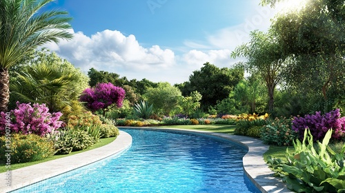 Fototapeta - Garden paradise with a pristine swimming pool lush plants colorful flowers and serene countryside ambiance ideal for leisure