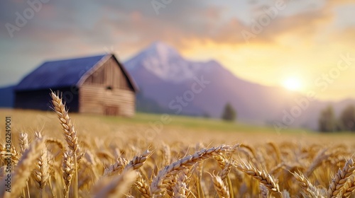 Fototapeta - Picturesque old barn nestled in a lush rolling countryside landscape with a majestic mountain peak in the background during a beautiful autumn sunset Peaceful tranquil and serene rural scene