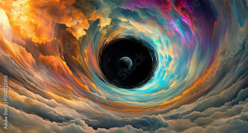 Swirling red and orange clouds of gas and dust are twisting around a black hole creating a colorful wormhole in the universe
