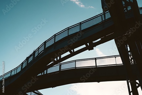 Fototapeta - Winding metal pedestrian bridge with railings under a blue sky