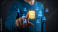 >Naklejka na meble>glowing Businessman touching real time database icon surrounded by user profile illustrations, symbolizing the future of digital data management and user interaction