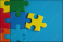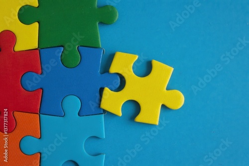 Colorful puzzle pieces against a bright blue background, highlighting a missing yellow piece ready to be placed.