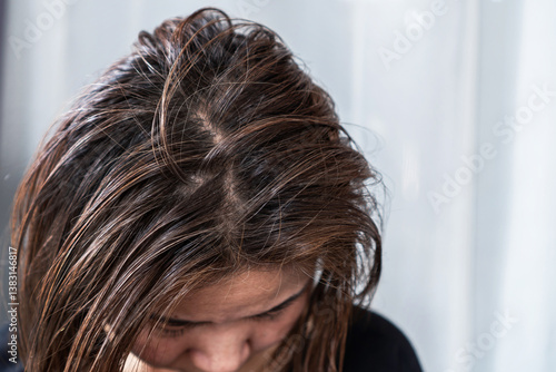 >Naklejka na meble>asian woman with oily scalp and thinning hair, feeling uncomfortable with greasy roots and hair loss, possibly caused by scalp problems like dandruff, eczema, or too much oil production