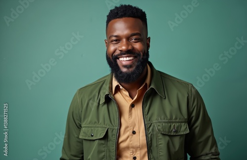 >Naklejka na meble>Portrait of smiling African American man in green jacket. Happy male in stylish outfit, brown shirt. Black guy portrait looks at camera. Professional, successful, confident, attractive.