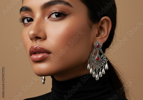 An elegant woman with beautiful makeup, wearing intricate earrings, looks towards the camera.