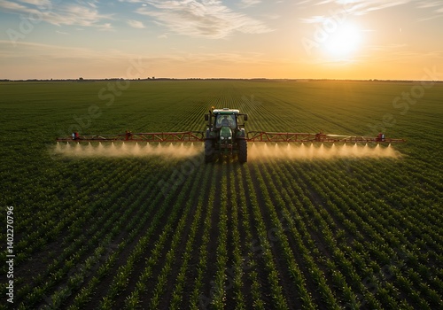 >Naklejka na meble>Agriculture machine spraying pesticide in green field. Tractor irrigating corn crop at sunset. Modern farm equipment treating plants for protection in rural landscape