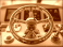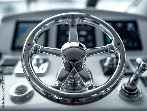 >Naklejka na meble>A sleek, polished chrome ship's steering wheel with modern technological displays in the background, indicating a luxury boating experience.