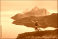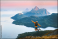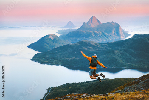 >Naklejka na meble>Man traveler jumping in mountains travel in Norway active summer vacations, male tourist hiking solo healthy lifestyle freedom success concept enjoying sunset islands and sea Helgeland landscape