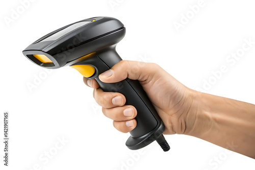 Fototapeta - Hand holding barcode scanner for retail and inventory on transparent background