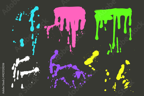 Graffiti spraypaint splatters set. Grunge colorful splashes and drips. Paint spots and blob shapes. Collage neon bold colors element. Dirty liquid silhouette. Vector hand drawn illustration.