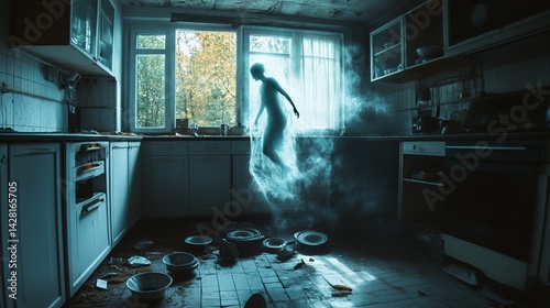 Fototapeta - Ghost floating in a chaotic, abandoned kitchen filled with broken dishes, dust, and dirt, creating a hauntingly eerie atmosphere that evokes feelings of fear and mystery