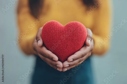 Woman holding red knitted heart symbol of love and compassion
