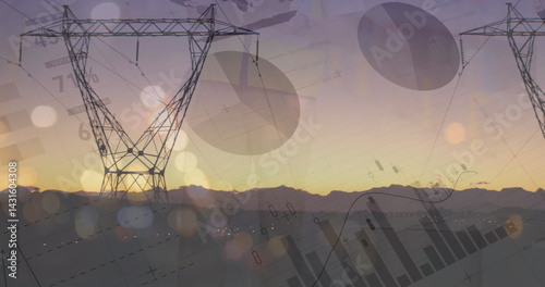 Fototapeta - Image of financial data over electricity poles at sunset