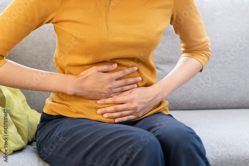Fototapeta - Young Asian woman suffering stomach pain from food poisoning.